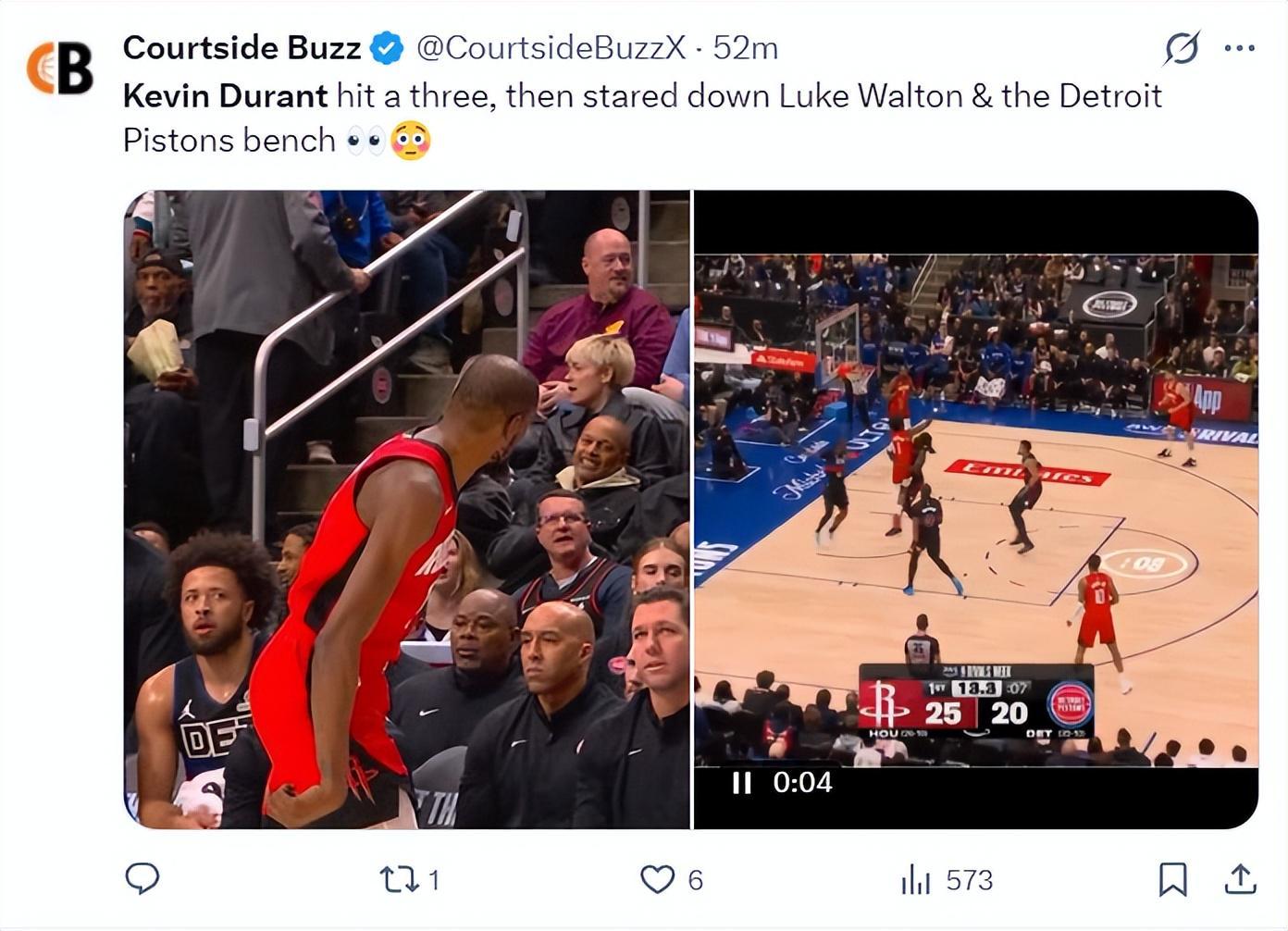 第一节杜兰特命中几乎压哨的三分球后,杜兰特怒视着活塞替补席与卢克-沃顿。