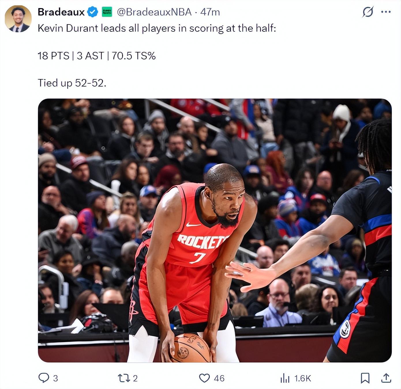 北京时间1月24日,火箭以111-104复仇活塞。这场比赛37岁的杜兰特又鏖战了41分钟,加上背靠背第一场打费城的44分钟,两场比赛老头子打了足足84分钟(不足24小时),但杜兰特的球场激情依旧在,他多次跟活塞替补席、看台球迷对喷,全场比赛拿到32+7+5三分上演死神降临。第一节杜兰特命中几乎压哨的三分球后,杜兰特怒视着活塞替补席与卢克-沃顿。第二节杜兰特在...