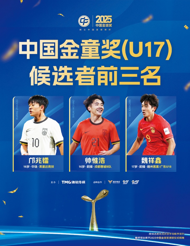 中国金童奖(U17)候选前三:邝兆镭(16岁,莱里达竞技)、帅惟浩(16岁,成都蓉城B队)、魏祥鑫(17岁,梅州客家/广东U18)